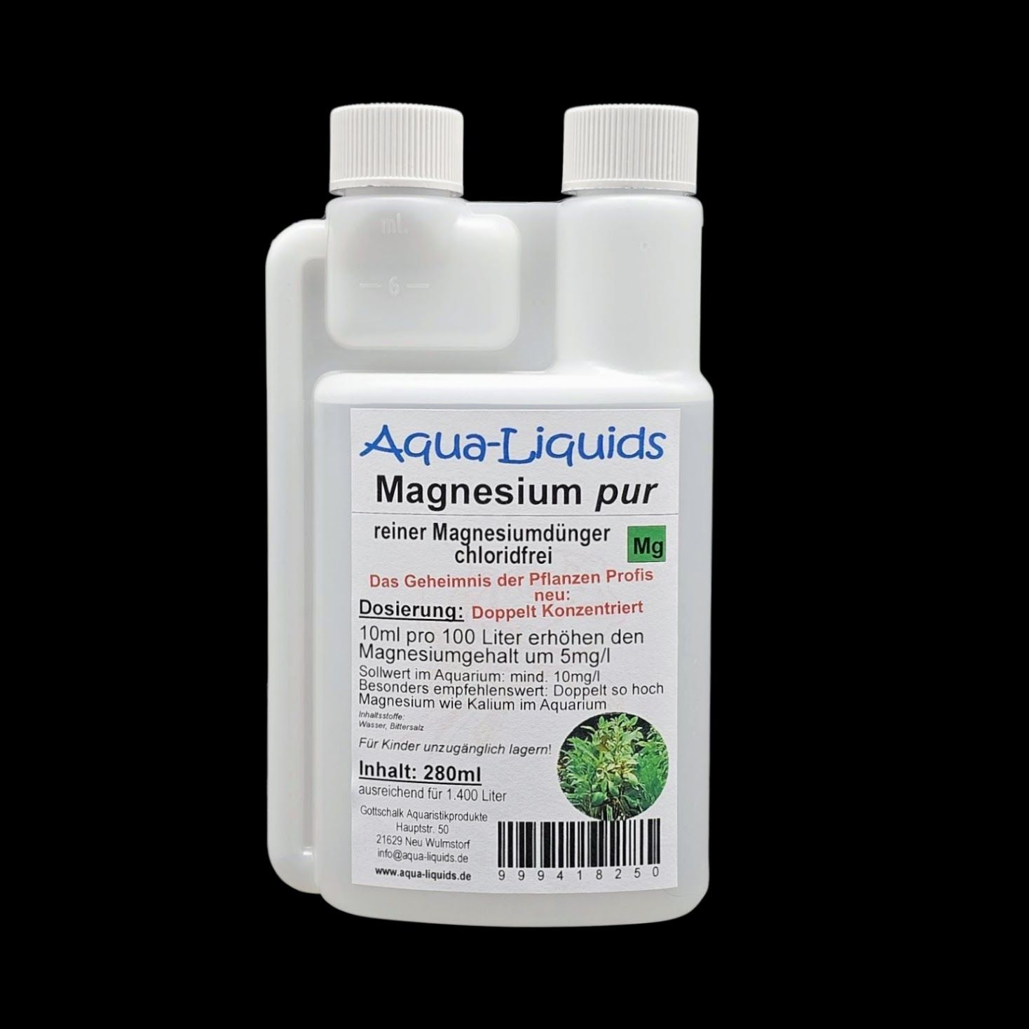 Reiner, chloridfreier Magnesiumdünger. Das Geheimnis der Wasserpflanzen Profis. Jetzt doppelt konzentriert. 10ml pro 100 Liter erhöhen den Magnesiumgehalt um ca. 5mg/l. Sollwert im Aquarium: mind. 10mg/l. Besonders empfehlenswert ist eine Magnesiumkonzentration, die doppelt so hoch ist, wie die Kaliumkonzentration. 280ml sind ausreichend für 1.400 Liter